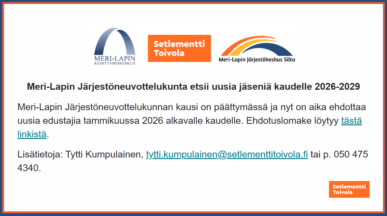 Meri-Lapin Järjestöneuvottelukunta etsii uusia jäseniä kaudelle 2026 -2029. Mainoksessa lukee tammikuussa alkavalle kaudelle, mutta kausi alkaa poikkeuksellisesti toukokuussa. Ehdokasasettelu loppuu…